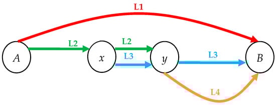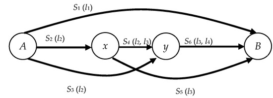 The example of a simple bus network in Figure 1 illustrates the core principle influencing the results of an assignment model directed to the bus networks. In actual practice, a transportation passenger always finds the most economical route (i.e., the least travel time) to their destination. Passengers boarding at station A and traveling to station B would rationally consider line 1 (L1) in their path selection as it is the direct service to the desired destination from the originating bus stop. From another perspective, L2 (with transfer at y or x) could be included in their desirable options if they were aware that it decreases overall journey time. Then, users would take the first vehicle to arrive on the two routes. In another situation, L1 might become unattractive to passengers if intelligent information on the residual wait time for L2 and the probable wait time at stations y and x is made accessible. All users would board L2 and then make transfers, even if L1 has the first arriving vehicle. This issue is referred to in the literature as the common lines problem (CLP) [6], in which customers would always opt to board the first coming bus among specified alternative lines if the target/main line is unavailable. The CLP is concerned with whether the user boards the approaching vehicle of a line, waits at the stop for the following vehicle of a different line, or goes to a different stop in search of other options. The whole CLP solution relies on the amount of data accessible at each stage and the choice made at that stage [7].