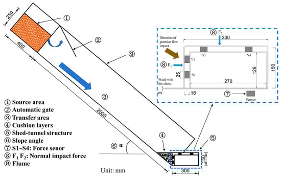 The model experiment setup consists of three main parts: the source area, the transfer area, and the shed tunnel. The slope angle α can be adjusted between 40° and 60°. The dimensions of the source area are 0.4 m in length, 0.3 m in width, and 0.4 m in height. The transfer area is 2.0 m long, 0.3 m wide, and 0.4 m high. A cushion layer can be set between the slope toe and the shed tunnel, as well as on the top of the shed tunnel. The dimensions of the shed tunnel are 0.3 m in length, 0.3 m in width, and 0.15 m in height, as shown in Figure 1. The granular flow particles used in this study have a size range of 10 mm to 20 mm, and the total mass of the granular flow is 50 kg. To measure the impact forces of granular flow on each face of the shed tunnel, the individual faces of the shed tunnel are separated. Bolts are used to connect each face to sensors, and they are fixed at the slope toe. In Figure 1, F1 represents the normal impact force on the front face of the shed structure, which is measured by the force sensors S1 and S2. F2 represents the normal impact force on the top surface of the shed structure, measured by the force sensors S3 and S4.
