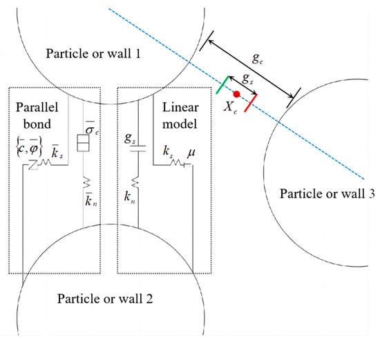 To consider the influence of the moment between particles, we have chosen the linear parallel bond model in this study. This model reflects the contact between particles and between particles and walls, as shown in Figure 2. The linear parallel bond model is an extension of the linear model that incorporates parallel bonds capable of bearing bending moments. This addition allows for the transmission of both moment and bonded force when combined with the linear model. If the load exceeds the strength limit, the parallel bond will break.