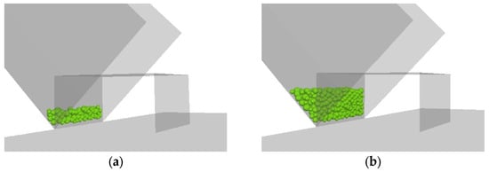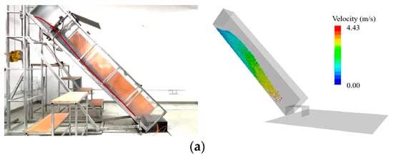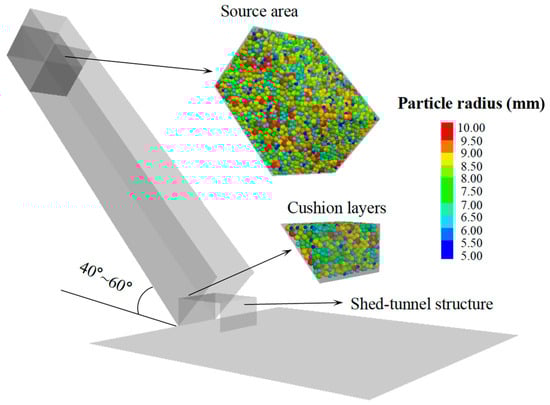 The numerical simulation model is established on a 1:1 scale based on the model experiment setup, as shown in Figure 3. In the PFC model, the source area is composed of 31,842 spherical particles with a density of 2650 kg/m3. The size of the particles is controlled at 10–20 mm, which is inconsistent with the granular material used in the model experiments. The three-dimensional geometric chute model and shed tunnel structure are constructed using wall elements, consisting of a total of 18 facets. The contacts between particles are simulated using a linear parallel bond model.