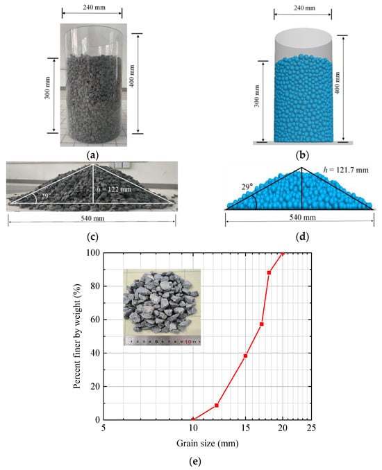 Comparison of test results and PFC numerical results of the granular column collapse. (a) Granular column collapse test; (b) PFC model of the granular column collapse test; (c) experimental heap morphology; (d) simulated heap morphology; (e) grading curve of the granular material.