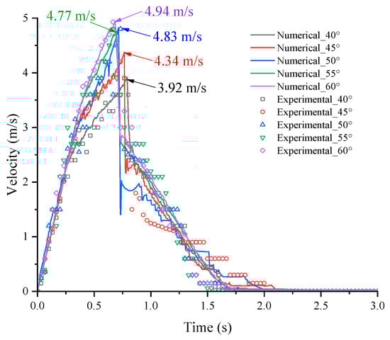 The motion velocity, impact force, and other characteristics of debris flows are significantly influenced by the slope angle. To analyze the influence of slope angle, granular flow experiments are conducted at five angles: 40°, 45°, 50°, 55°, and 60°. To analyze the velocity evolution of the granular flows, a total of 20 particles at the front edge of the granular flow are monitored. The time history of the average velocity of monitored particles is shown in Figure 5.