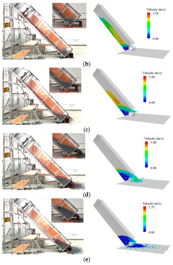 Snapshots of the granular flow in the experimental test and numerical simulation. (a) t = 0.7 s; (b) t = 1.0 s; (c) t = 1.3 s; (d) t = 1.6 s; (e) t = 2.5 s.