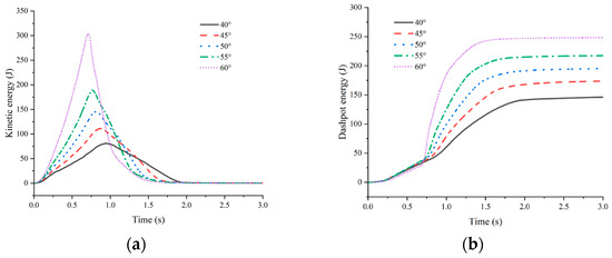 Kinetic energy and dashpot energy time history at different slope angles. (a) Kinetic energy; (b) dashpot energy.