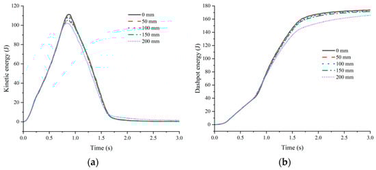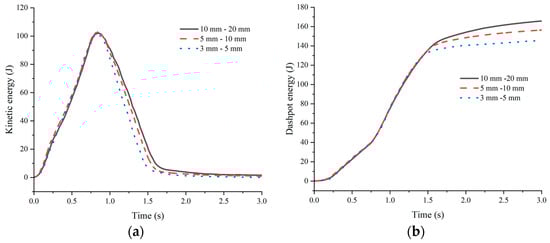 Kinetic energy and dashpot energy time history at different thicknesses of cushion layers. (a) Kinetic energy; (b) dashpot energy.