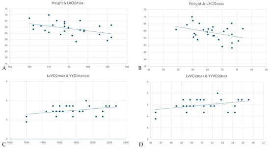 Significant correlations between variables. (A) Correlation between Height and LVO2max. (B) Correlation between Weight and LVO2max. (C) Correlation between LvVO2max and YYDistance. (D) Correlation between LvVO2max and YYVO2max.