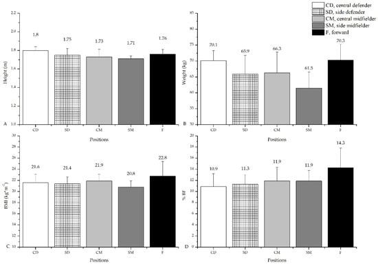 The playing positions into which the soccer players were categorized were central defenders (CD, n = 5), side defenders (SD, n = 7), central midfielders (CM, n = 6), side midfielders (SM, n = 5), and forwards (F, n = 4). Goalkeepers were excluded from the study.