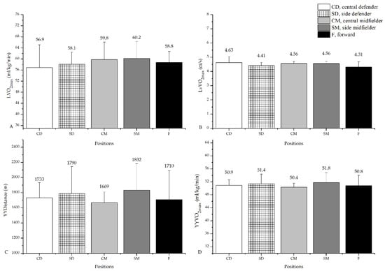 Moreover, it has been observed that the different tactical roles of playing positions affect players’ running performance [,] in matches. In a recent review study [], it was reported that Sporis et al. (2009) [] observed midfielders to have higher VO2max values than forwards and defenders. In contrast, Gil et al. (2007) [] observed forwards to have higher VO2max than midfielders and defenders. However, there are also studies that did not find significant differences in VO2max between playing positions [,,]. The researchers [] suggested that the observed differences may be due to the different competitive levels of the participants.