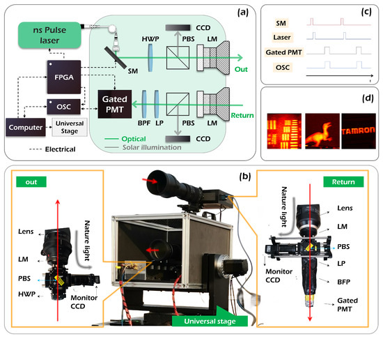 In conclusion, we have present a home-built bistatic pulsed-LiDAR system equipped with a gated-PMT detector, providing readers with an in-depth understanding of its operational principles for construction and utilization. To obtain high SNR data, a comprehensive suite of denoising techniques was employed, including temporal, spatial, spectral, and polarization filtering methods. The proposed system demonstrated the capability to operate effectively under various challenging conditions, including daytime and other complex scenarios, leveraging advanced denoising technologies. Especially, it possesses the capability to mitigate the impact of scattering and solar background radiation, which is the guarantee that the equipment can work properly outdoors. Regarding operational range, the system exhibited impressive capabilities, achieving distances exceeding 4000 m in clear daylight, 19,200 m under nocturnal conditions, 6700 m during hazy daytime conditions, and 2000 m amidst daylight rain. Furthermore, it boasts an angular resolution of 0.01 mrad. By applying compressive sensing algorithms, it is observed that a sampling rate of 20% was adequate for discerning basic signal outlines, thereby meeting the requirements of imaging detection, significantly reducing processing time. The findings presented herein offer valuable insights into the pragmatic realization of imaging systems with promising potential for compact construction, facilitating the acquisition of data for subsequent processing and application.