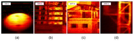 Next, the measurements were made in night conditions, which can play the best performance of the LiDAR system due to the high SNR data acquisition. Here, as shown in Figure 5, we present four long-range imaging results at distances of approximately 9000 m (building), 13,000 m (TV tower head), 14,000 m (building), and 19,200 m (building). These distances correspond to locations that are accessible and offer unobstructed views from the hillside of the Qinling Mountains. Similar to the previous section, TOF is employed for measuring these distances with an image pixel resolution of 128 × 128. However, each pixel’s acquisition time is set to 1 ms. As depicted in Figure 5, the reconstructed image enables extraction of profiles and typical details. Given that the building at 19,200 m is the farthest target visible within the field of view, we contend that this system has the capability to detect even longer distances under nighttime conditions.