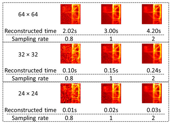 Imaging frame rates are paramount in long-range imaging LiDAR systems, particularly concerning real-time imaging capabilities. A thorough investigation into the system’s real-time imaging performance was conducted, as depicted in Figure 7, which illustrates the time consumed by imaging reconstruction across various imaging parameters, including frame rates. The experimental findings underscore the intricate correlation between imaging frame rates and sampling rates with the image resolution, alongside the computational power of the computing hardware. Remarkably, employing a standard computer setup facilitates the consistent achievement of imaging frame rates at 24 Hz across diverse sampling settings, while upholding a resolution of 24 × 24 pixels.