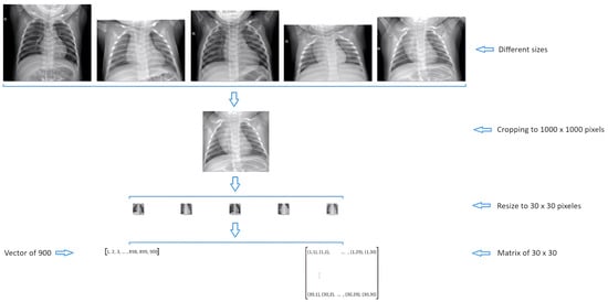Regarding selection and resizing, the adoption of selection criteria based on specific dimensions (>1000 pixels) is emphasized to prevent deformations during resizing, a step not mentioned in previous studies. This method ensures the preservation of relevant information through standardized cropping to 1000 × 1000 pixels and further reduction to 30 × 30 pixels, therefore optimizing the uniformity and quality of the images for subsequent analysis.