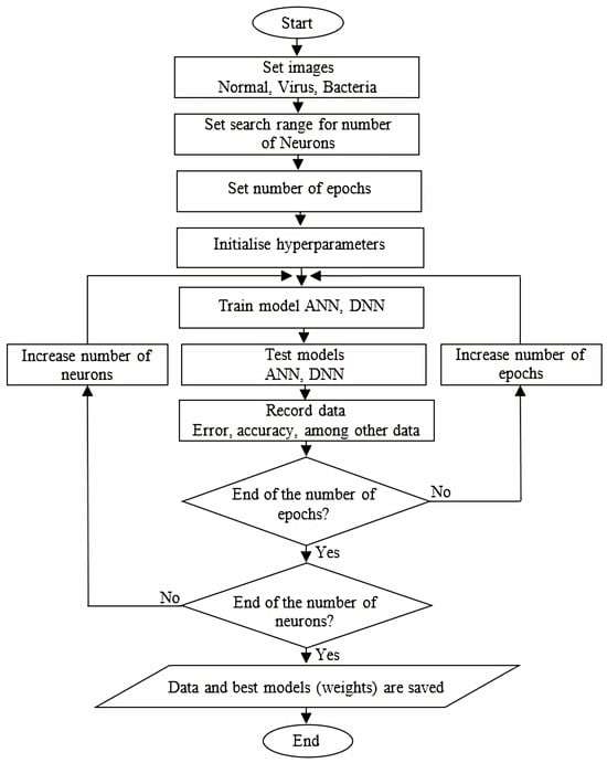 Figure 9 can be referred to, which depicts the flowchart. With each increase in neurons and epochs, information was gathered to analyze the generated models. Additionally, experiments were conducted with both balanced and unbalanced data, seeking optimal cases for each package from among 1900 possibilities.