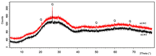 The results of the XRD analyses of AGW1 and AGW2 (Figure 1) have confirmed the expected amorphous character of the glass with only a minor content of crystalline quartz (Q; PDF00-001-0649). The curves of both samples are very similar, with no visible phases coming from the safety film or the heating elements.