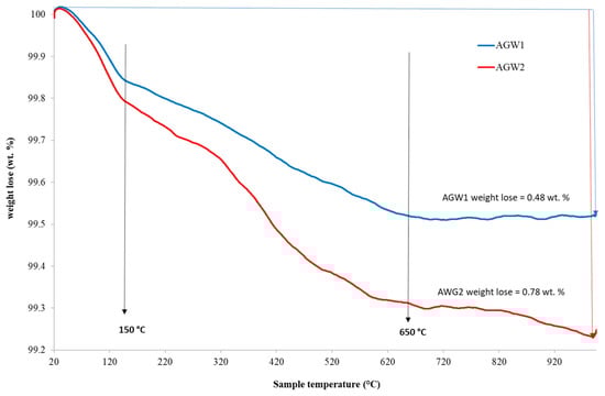 AGW samples were further characterized by thermogravimetric analysis (Figure 2). Glass samples of 21–24 mg were heated in an inert helium atmosphere (at a flow rate of 20 mL·min−1) to prevent oxidation of the samples and to avoid affecting their quality. The change in weight loss was monitored by heating the samples at a constant heating rate of 10 °C min−1 from 25 °C to 1000 °C, which is sufficient to determine the volatile content of the finely crushed glasses. The glass contains a safety layer, which is typically polyvinyl butyral (PVB), whose main degradation starts at temperatures in the range of 260–330 °C [47,49,53]. This decrease can be divided into two phases [54]. In the first phase (up to 200 °C), moisture evaporation occurs, and in the second phase (200–900 °C), organic decomposition occurs, which is consistent with our results. These mass losses are seen from the TG curves in Figure 2, where moisture evaporation occurs with the first temperature increase up to 150 °C and amounts to 0.16 wt.% (AGW1) and 0.21 wt.% (AGW2). The subsequent decrease in signal in the temperature range of 150–650 °C is related to the gradual release of organic matter (e.g., polycarbonate, polyethylene terephthalate, etc.). This resulted in the release of gaseous molecules CO, CO2, CH4 and H2O from the hydroxyl groups bound to silica. The loss of organics was monitored up to a temperature of 1000 °C, which was sufficient to confirm that no undesirable substances were released.