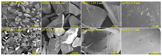 Scanning electron microscopy (SEM) micrographs have been used to display the surfaces of AGW1 and AGW2 samples. Figure 3 shows the state of the ground glass before its exposure to the alkaline solution. Individual images are at the same magnification. It is evident from the pictures that the glass grit is sharp-edged after being crushed. In the larger fractions, it is possible to see traces of crushing as well as crushed-glass dust particles, especially in the case of the AGW2 1.25–2 mm fraction. These crushing residues (traces and dust particles) are more evident at 10,000× magnification (Figure S6 of the Supplementary Files).