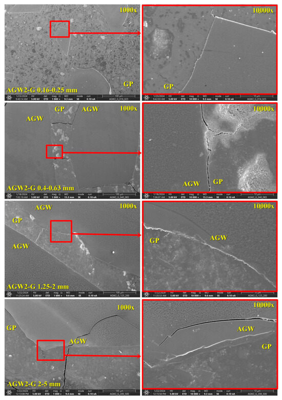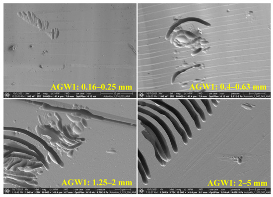 Figure 4 shows the AGW1 particles of different fractions after exposure to the alkaline solution at the same magnification (10,000×). The image reveals surface degradation in the form of oval, almost parallel grooves. The larger the original particles, the greater the degradation. Similar degradation traces have also been found in AGW2 (Figure 5). In comparison with AGW1, the incisions are almost parallel, but wherever they cross, the local damage is deeper. A comparison of the two images shows that AGW2 has more surface deterioration than AGW1, in both the extent and depth of damage.