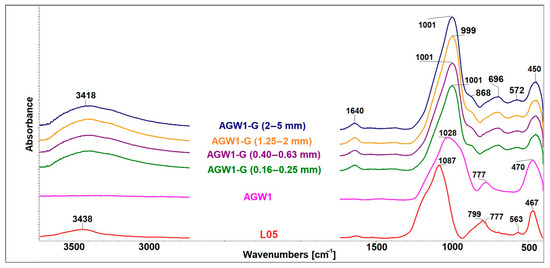 The ATR-FTIR spectra of the geopolymer materials (AGW1-G series with variable grain size) and a comparison with L05 and AGW1.