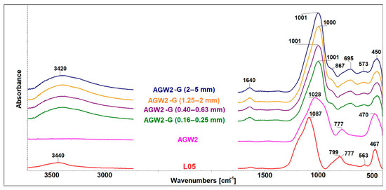 The ATR-FTIR spectra of the geopolymer materials (AGW2-G series with variable grain size) and a comparison with the L05 and AGW2.