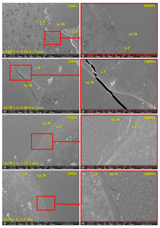 The SEM images of the geopolymer composite with AGW1 particles (AGW1-G): The left side shows the images at lower magnification (2000×), while the right side contains details of the images on the left at higher magnification (10,000×). The images depict the geopolymer matrix (GP) and particles of automotive glass waste (AGW).