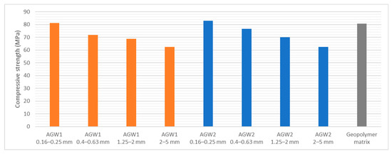 The determination of the AGW1-G and AGW2-G mechanical properties showed relatively high 28-day compressive-strength values despite the non-optimal ratio of the geopolymer matrix to the aggregates for some fractions. In the case of larger particles, sedimentation occurred, which was evident in the geopolymer solids. It can also be assumed that finely ground AGW could be actively involved in the geopolymer reaction [42,68].