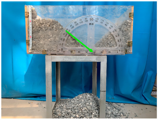The mechanical parameters (such as density, particle size distribution, grading, internal friction angle, and cohesion) of the ore-rock bulk materials play an important role in the overall fluidity of the storage materials and the force condition of the ore-pass wall. In order to ensure the accuracy of the experimental results, waste rock from a certain mine was crushed and screened into different sizes in the laboratory to keep its mechanical properties close to the ore-rock bulk in situ. According to the previous studies on the physical parameters of bulk materials, the bulk density of the broken stones, which was obtained by the water injection method [23], was 2050 kg/m3. On this basis, the quartering method was used to scale the building stone samples, the particle size distribution, and the mass proportion of the scaled samples were obtained by using different grid screens, as shown in Table 1.