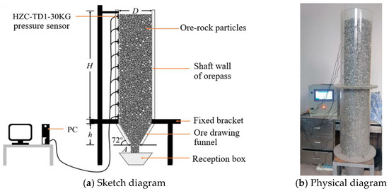 Taking the ore pass of an iron mine in Northeast China as an example, the parameters of the ore pass storage section are 32 m high and 6 m in diameter, and the parameters of the ore-drawing funnel below the storage section are as follows: height—6.4 m, width of ore-drawing port—3 m, and sidewall angle—72°. Combined with the actual geometric size and production conditions of the ore pass, the geometric similarity ratio of 1:20 was selected to construct the physical similarity experiment platform. In the physical model, the ore-pass storage section and the ore-drawing funnel have the same center line; the height of the storage section H is 1.6 m, the diameter D is 0.3 m, the height of the funnel h is 0.32 m, the width of the ore-drawing port A is 0.15 m, and the angle of the funnel side wall is 72°, as shown in Figure 2. In addition, before building the model, the inside of the acrylic silo was polished with sandpaper to simulate the friction effect of the ore pass on the ore-rock bulk in the process of ore drawing.