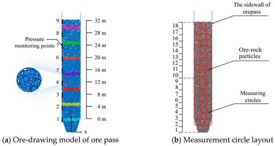 According to the geometric parameters of the ore pass in situ, as shown in Section 2.2 in this paper, when the numerical model is established, the center of the drawing port is considered as the coordinate origin, and the total height of the ore storage section and the ore-drawing funnel is 38.4 m, as shown in Figure 4a. In order to monitor the lateral pressure of the ore-pass wall, 9 monitoring points, numbered 1–9 from bottom to top, are arranged along the left shaft wall at 4 m intervals. For observing the flow state of the ore-rock bulk, the ore-rock particles with different colors are placed in layers every 4 m upward from the lower to upper in the ore storage section, there are seven layers.