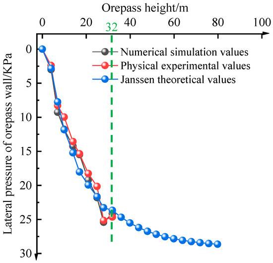 Although this study did not carry out more relevant research based on Janssen theory, and only compared the lateral pressure calculated results of the Janssen equation with those of physical experiments and numerical simulations, it can be seen from Figure 5 that the static lateral pressure values obtained by the three methods have a good consistency. Based on the physical similarity experiment, it is found that the maximum errors between the numerical simulation and the theoretical calculation via the Janssen formula are, respectively, 11.8% and 18.1%; this indicates that the numerical model has a certain reliability in the process of analyzing the characteristics of the pressure distribution on the side wall of the ore pass.