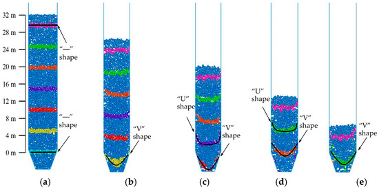 The important factors affecting the ore-rock’s macroscopic flow pattern are the friction between ore-rock particles, particles, and the shaft wall, and the constraint of funnel boundary. In the ore-drawing process, the macro-shape of rock particles with different flow rates gradually changes from a “—” shape to a “U” shape, and finally, a “V” shape is drawn out.