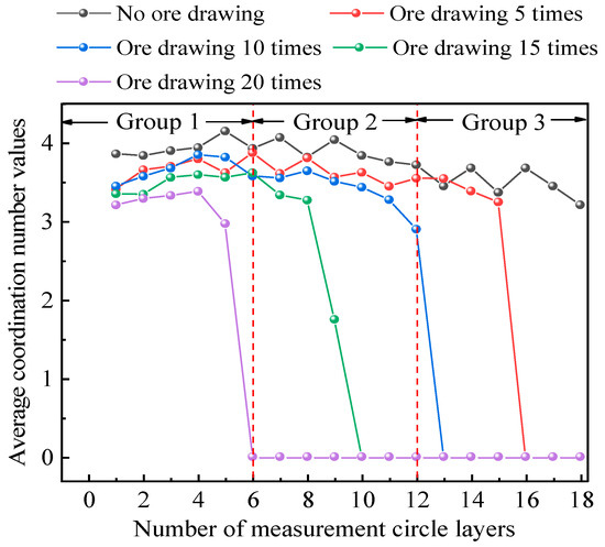 It can also be seen from Figure 7, that before the ore drawing begins, the average coordination number of Groups 1 to 3 is about 3.84~4.15, 3.72~3.2~4.05, and 3.21~3.68, respectively. The change relationship of the coordination numbers of different groups is Group 3 > Group 2 > Group 1, while the corresponding coordination number of each group has the opposite fluctuation rule. When the ore-rock was drawn five times, the coordination numbers of Group 1 gradually increased from 3.41 to 3.87, that of Group 2 fluctuated to decrease and was similar to the change rule of the coordination numbers without ore drawing, and that of Group 3 decreased rapidly from 3.54 to 0. When ore drawing 10 times, the coordination numbers of Group 1 increased from 3.44 to 3.85, and those of Group 2 and Group 3 decreased exponentially with the increase in the number of measurement circles and finally stabilized at about 0. With the increase in the ore-drawing times, the change rule of the coordination numbers of each group is almost consistent, decreasing exponentially to 0.