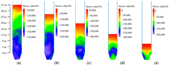 It can be seen from Figure 8 that, before the ore drawing begins, the ore-rock bulk has a large stress concentration phenomenon in the range of 0–16 m, and the stress increases with the increase in the shaft depth. When the ore-rock was drawn 5 times, the stress value of the ore-rock in the ore pass decreased to a different degree—that is, the high-stress (blue part) area decreased. this indicates that the decrease in the amount of ore-rock in the storage section is the main reason for the stress change and the area decrease in the high stress. With the increase in the ore-drawing times, the total amount of ore-rock in the ore pass is constantly decreasing, and the high-stress concentration area is gradually reduced to the drawing funnel from the range of 0–16 m. When the ore-rock in the storage section is completely moved into the drawing funnel, the high-stress area in the storage section completely disappears.