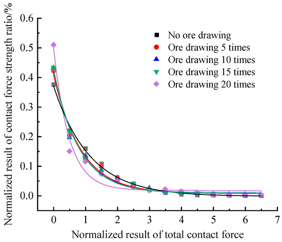 There are five curves in Figure 9, which represent, respectively, the change characteristics of contact force before the ore drawing begins and when the ore draws 5, 10, 15, and 20 times. It can be seen from the probability distribution of contact force strength in Figure 9 that the contact force strength accounts for 85% in the range of 0.0~2.0, while it accounts for less than 15% in the range of 2.0~7.0. This shows that the weak force chains are the main component, while the strong force chain is the important component of the force chain network, and the strong and weak force chains are interwoven to form the force chain network, which maintains the stability of the whole bulk system. At the same time, with the increase in ore-drawing times, the force chains in the whole bulk system continue to break and recombine under the action of the tangential forces, and the proportion of weak force chains decreases exponentially, while that of strong chains tends to be stable. This indicates that the ore-rock particles contained in the weak force chain contribute little to the stability of the whole system, while those in the strong force chain play an important role in the stability of the whole system.
