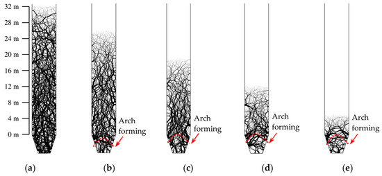 It seems that the material stored in the ore pass has a strong compression effect before the ore drawing, which is only a manifestation of the gravity compaction of the stored materials. Before ore drawing begins, as shown in Figure 10a, the stored ore-rock material in the ore pass seems to be in a static state, but in fact, due to the irregularity of the ore-rock blocks, the geometric center of each block does not coincide with its gravity center, resulting in the rotation and movement of the ore-rock block in the particle system and constantly changing its spatial arrangement form and the contact mode between particles until it can no longer overcome the resistance from the other particles. As a result, the contact strength between the ore-rock blocks reaches the maximum value, and the voidage of the bulk system reaches the minimum value. As shown in Figure 10b,c, with the ore-rock near the funnel port drawing out, the upper ore-rocks continue to move toward the funnel, the void ratio of the stored materials in ore pass increases, and the contact degree of ore-rock blocks decreases. So, the distribution state of strong and weak force chains also changes before and during ore drawing.