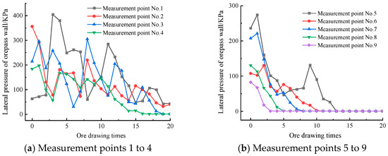 It can be seen from Figure 11 that, in the process of ore drawing, the dynamic lateral pressure on the shaft wall of each measuring point basically fluctuates exponentially and decreases, and the pressure value increases gradually from top to bottom (point 9 to 1), while that of some measuring points (point 1 and 3~7) increases significantly compared with the static lateral pressure before ore drawing. The maximum pressure value appears after a period of ore-drawing time, and not at the moment of initial drawing. At the beginning of ore drawing, the loose ore-rock body will produce the phenomenon of the particles’ rotation, and they will slip under the action of their own gravity, which breaks the initial mechanical equilibrium and causes the mechanical behavior of “arch forming-arch collapsing” continuously inside the stored materials. The formation of the arch, which may be instantaneous and unstable, causes the increase in the lateral pressure value of the measuring point near the arch foot—that is, the “over-pressure phenomenon”. The collapse of the arch leads to the instantaneous decrease in the lateral pressure value near the measuring point. The phenomenon of “arch forming- arch collapsing” occurs alternately in the process of ore-rock flow, which results in the exponential fluctuation decreasing of dynamic lateral pressure at each measuring point and the peak lateral pressure appearing after a period of time. This is consistent with the results of previous research on bulk and spontaneous arch formation during ore-rock flow [42,43].