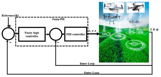 Manual tuning cannot lead to suitable optimal tuning, but the fuzzy PID tuning method automatically adjusts model parameters against a physical object, which leads to suitable optimal tuning. To overcome this, a fuzzy PID-tuned control design for a quadcopter controller was developed. An aerial vehicle flight test mimicked cruising flight conditions, with adjustments made to the pitch and yaw axes []. From Figure 3, it is understood that the output of the fuzzy logic controller is used as an input for the PID controller. The nonlinear PID controller optimizes the plant system-based fuzzy logic outputs. The outputs of the plant are provided for the fuzzy logic controller. Based on the plant feedback system, the fuzzy members on or off, and the results of the fuzzy are provided to the PID controller. The controller has two loops: the inner loop and the outer loop. The inner loop penalizes the PID gain, whereas the outer loop penalizes the fuzzy membership functions. The inner loop consists of a PID controller, whereas the outer loop consists of a fuzzy logic controller.