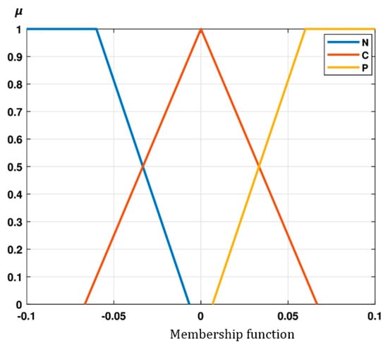 The input membership functions are presented in Figure 4. The blue line indicates the negative input, the red line indicates the input close to zero, and the yellow line represents the positive input.