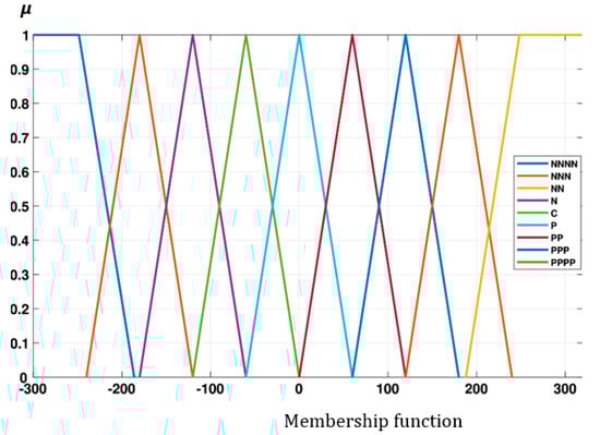 The output membership functions are presented in Figure 5, and the most negative (NNNN), the most negative (NNN), more negative (NN), negative (N), close to zero (C), positive (P), more positive (PP), most positive (PPP), and the most negative (PPPP) are represented by blue, maroon, yellow, purple, green, dark red, turquoise, and red, respectively.