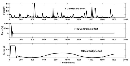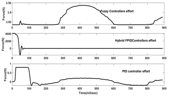 The test results of the fuzzy, fuzzy PID, and PID controller efforts at the noise input are shown in Figure 11. The maintenance effort for a fuzzy logic controller alone (fuzzy controller effort) is usually less than that of a conventional control system. This is due to the fact that fuzzy logic controllers are less susceptible to changes in the system they are controlling and are more resilient. Because it shares some advantages with fuzzy logic controllers, such as being more efficient than traditional control systems, and with PID controllers, such as eliminating steady-state errors and minimizing overshoot and oscillations, the hybrid controller’s effort becomes smooth throughout the performance. Only the PID controller revealed some system-wide noise. This is due to the possibility that in complex systems with highly nonlinear dynamics or large time delays, controllers may find it difficult to deliver optimal control performance. The agricultural drone continued to operate as intended, with the fuzzy logic algorithm adjusting the issues based on feedback.