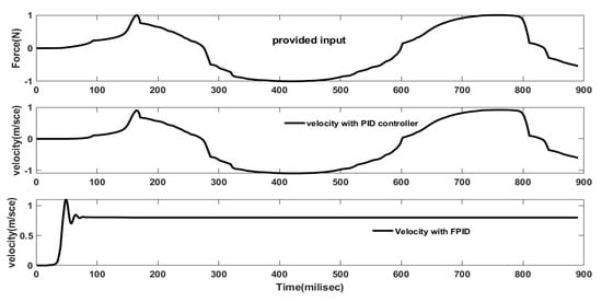 Figure 14 shows the agricultural drone’s velocity response. The agricultural drone that has a PID controller exhibits cyclical stability in its velocity, while the drone outfitted with a fuzzy PID controller displays steady velocity. The agricultural drone’s velocity may be readily adjusted to various operating conditions thanks to its fuzzy PID controller, which also requires less processing. These traits are common to fuzzy logic controllers. The agricultural drone’s velocity with the fuzzy PID controller has a smooth form, it is quick to achieve its maximum points, it overshoots, it settles quickly, and it may readily obtain a steady-state error. The agricultural drone’s PID controller-equipped velocity has a less smooth shape and is cyclically stable. Because PID controllers do not specifically take into account system constraints, including input or output limits, breaking these constraints could result in unfavorable behavior. The fuzzy PID technique balanced this controller effort. Because of this, fuzzy PID controllers can perform better in control than conventional PID controllers, particularly in systems that have uncertainties and non-linearities.