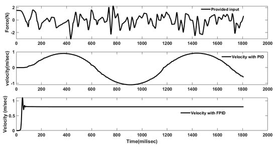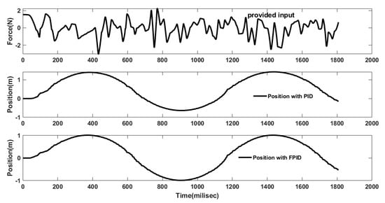 The input given was noise, as seen in Figure 12. The fuzzy PID (hybrid) and PID controllers’ performance with regard to the agricultural drone was obtained based on the input given. The performance of the position remained constant throughout, since there was no difference in the strength of the controller response to an input or output signal deviation. The controller gain for an agricultural drone in a control loop is the amount of action a controller will take at a specific point (position) below or above the setpoint.