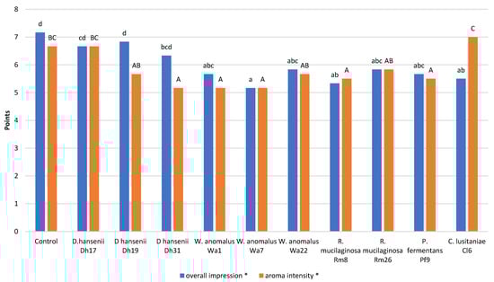Overall aroma impression and aroma intensity of sauerkraut produced with the addition of different yeast cultures based on a 10-point scale. Values with different Roman letters (A–C, a–d) of the same parameter indicate statistically significant differences at p < 0.05; Statistically significantly different parameters determined using ANOVA (p < 0.05) are marked with *.