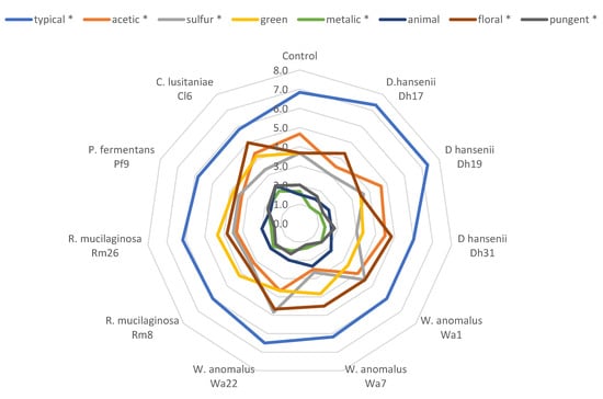 A spider web diagram visualising the aroma qualities of sauerkraut produced with the addition of different yeasts. Statistically significantly different parameters determined using ANOVA (p < 0.05) are marked with *.