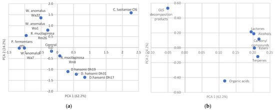 The introduction of cells of this microorganism into the fermentation process of sauerkraut resulted in a significant reduction in the amount of all components present in the product, both non-volatile, such as lactic acid, and volatile. Pichia fermentans is a typical beverage spoilage yeast found in apple juice, beer, soft drinks, must and wine [47]. It can assimilate a wide range of different carbon sources, including hexoses such as glucose and pentoses such as xylose [48]. Similarly, the yeast species W. anomalus is considered a yeast spoilage species [49]. Due to its aerobic metabolism, it develops slowly in the absence of oxygen [50]. This type of phenomenon was observed in the sauerkraut samples analysed. This strain neither caused excessive deacidification, which is its characteristic feature, nor did it produce large amounts of metabolites that negatively affect the quality. However, this does not change the fact that when microaerobic conditions are created, there is strong proliferation and a significant impact on the parameters of sauerkraut [4]. The discussed group of yeasts also included cultures that increased the decomposition of glucosinolates (probably, these compounds were partially metabolised as a carbon source), which resulted in an increase in the number of components produced by such decomposition [35,36]. The negative effects of this phenomenon are a reduction in the number of components with health-promoting activity and, on the other hand, the formation of a large number of compounds with an unpleasant, sulphurous aroma.
