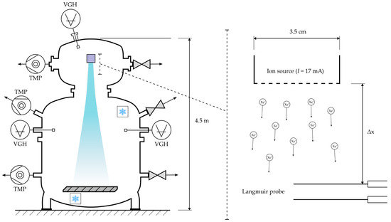 For spatially resolved probe diagnostics, two translation units are installed inside the vacuum facility, allowing 2D scans of the plasma plume in one plane. The unit for controlling the position in the radial direction has a translation range of 17 cm with positioning accuracy of , while the unit for setting the axial orientation has a range of . The probes are placed with a radial distance of from the RIT3.5 centerline axis, and an axial measuring range of 5 to 90 mm is employed.