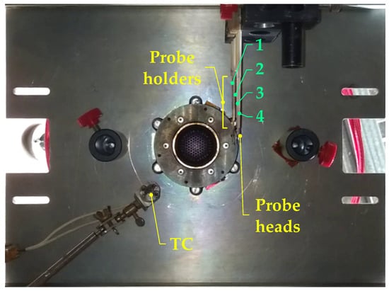 Bottom view of probe positioning. Four probes are aligned vertically with (1) nearest to and (4) most distant from the thruster. The distance between probes (1) and (4) is 40 mm. The positions of probe holders, probe heads and the fixed thermionic cathode (TC) are indicated by arrows. The translational movement in the horizontal direction is conducted from left to right. The vertical movement is performed in the direction out of the image plane.