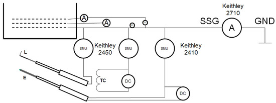 Schematic representation of the electrical connections and circuitry used in the experiment. Only two of the four installed probes are indicated. The emissive probe (E) is heated by the isolated DC power supply and connected to the SMU. The Langmuir probe (L) is directly connected to the SMU. The fixed thermionic cathode (TC) can be heated by isolated DC power supply and is connected to the SMU. All electrodes are capable of floating operation (no net electric current flowing to the plasma). The thruster is placed on the isolated platform (SSG), which can be connected to the facility ground GND either directly or via a Keithley multimeter. During the measurement, all probes are referenced to the SSG.