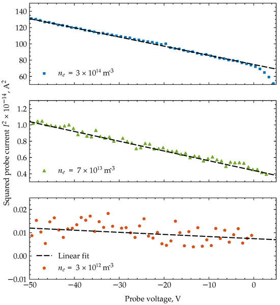 where A, e and denote the probe area, elementary charge and ion mass, respectively. From the experimentally measured slope, can be determined, and the applicability of the OML theory evaluated upon the appearance of the squared ion current values is a straight line. An example of such an evaluation is given in Figure 4. Based on the obtained data, it is manifested that over a wide range of electron densities the squared ion current represents a straight line.