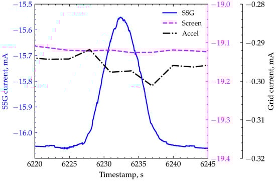 As will be shown in detail in Section 3, the main source of electrons in the self-neutralized ion beams is SEE stemming from the facility walls. The SSG represents part of the facility; thus, it is to be expected that violation of the neutralization by the probes should influence the value of the electric current from the SSG to the facility grounds. The electron and ion flows contribute to the measured electric current with opposite signs. Hence, the electron emission from the SSG’s surface should reduce the value of the measured SSG current. This circumstance is illustrated in Figure 5, where the SSG current together with the currents of the first and second RIT3.5 grids are highlighted.
