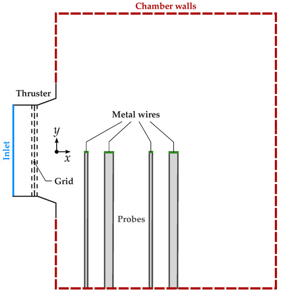 Schematic representation of the computational domain and applied boundary conditions utilized in the PIC-DSMC simulations for analyzing the self-neutralization of the ion beam. The geometry of the vacuum chamber, including the placement of parts of the RIT discharge chamber, grid and exhaust parts (marked as Thruster), the location and orientation of the probes (metal wires attached to dielectric casings) within the ion beam path, and the configuration of the chamber walls. Boundary conditions are depicted to illustrate the interaction points for ions and electrons with the objects encountered during the experiment, such as inlet and outlet conditions, thruster and probe boundaries, and wall interactions. The schematic specifies the conditions under which particles are introduced, reflected or absorbed, providing a visual guide to the simulation setup supporting the study’s findings on SEE and beam neutralization dynamics.